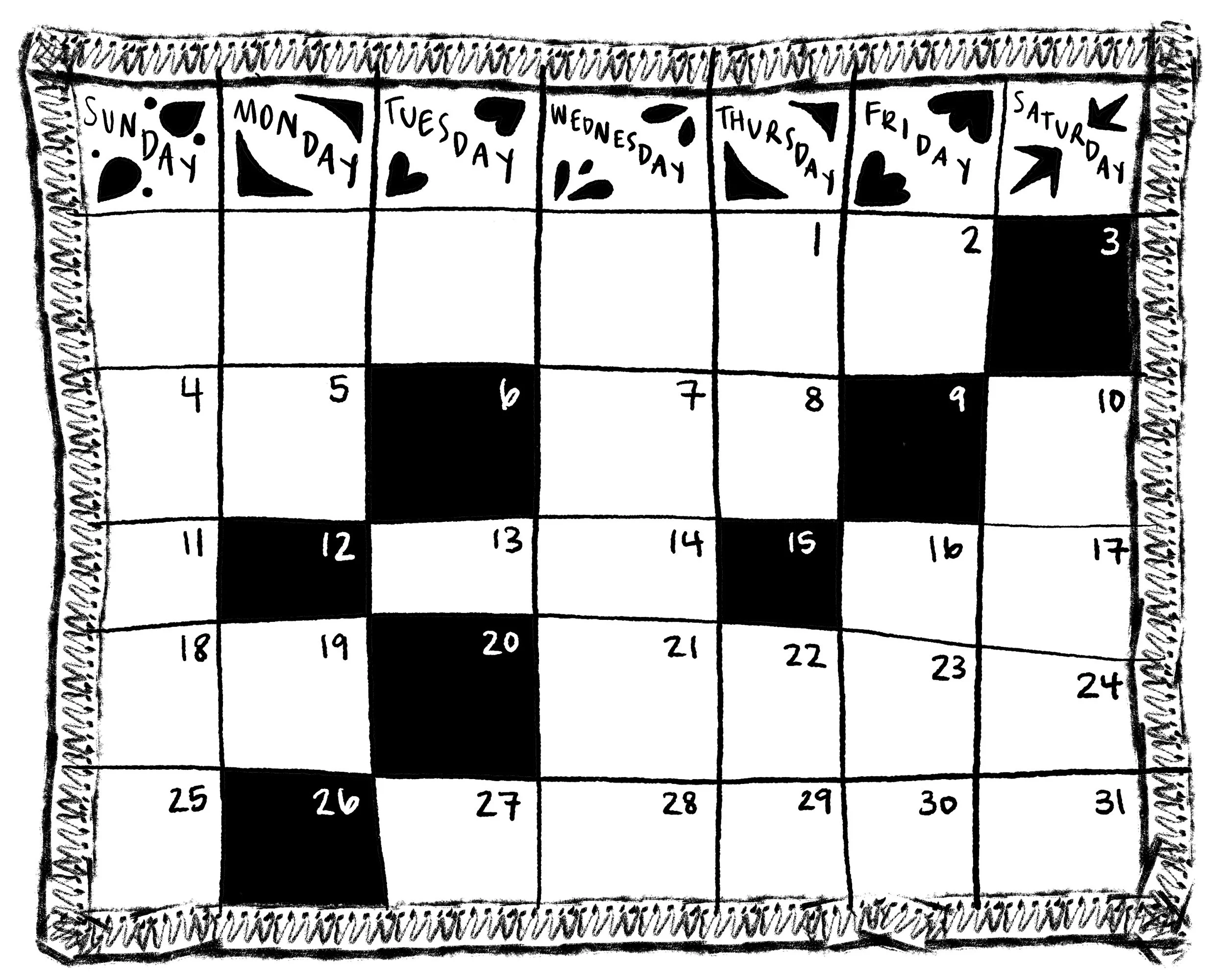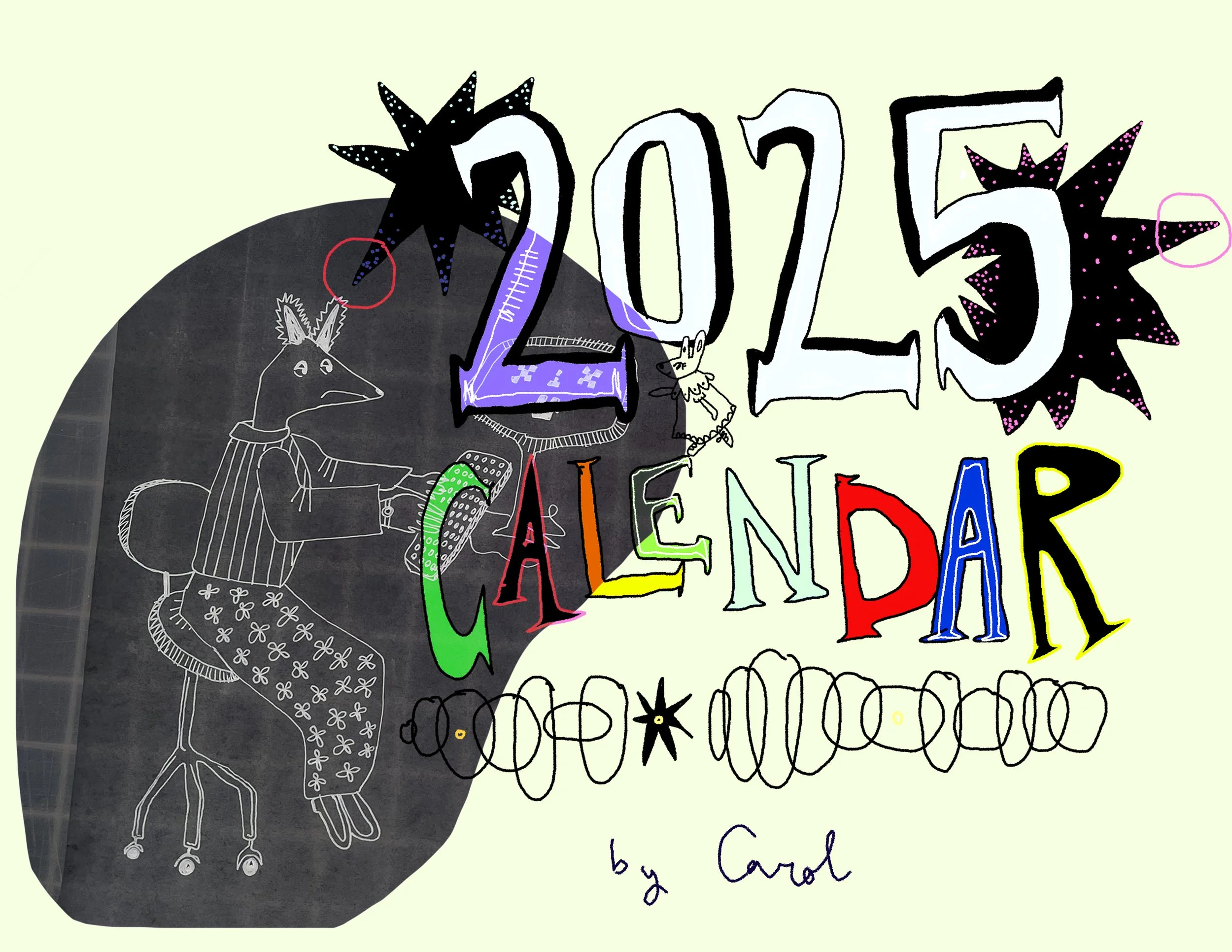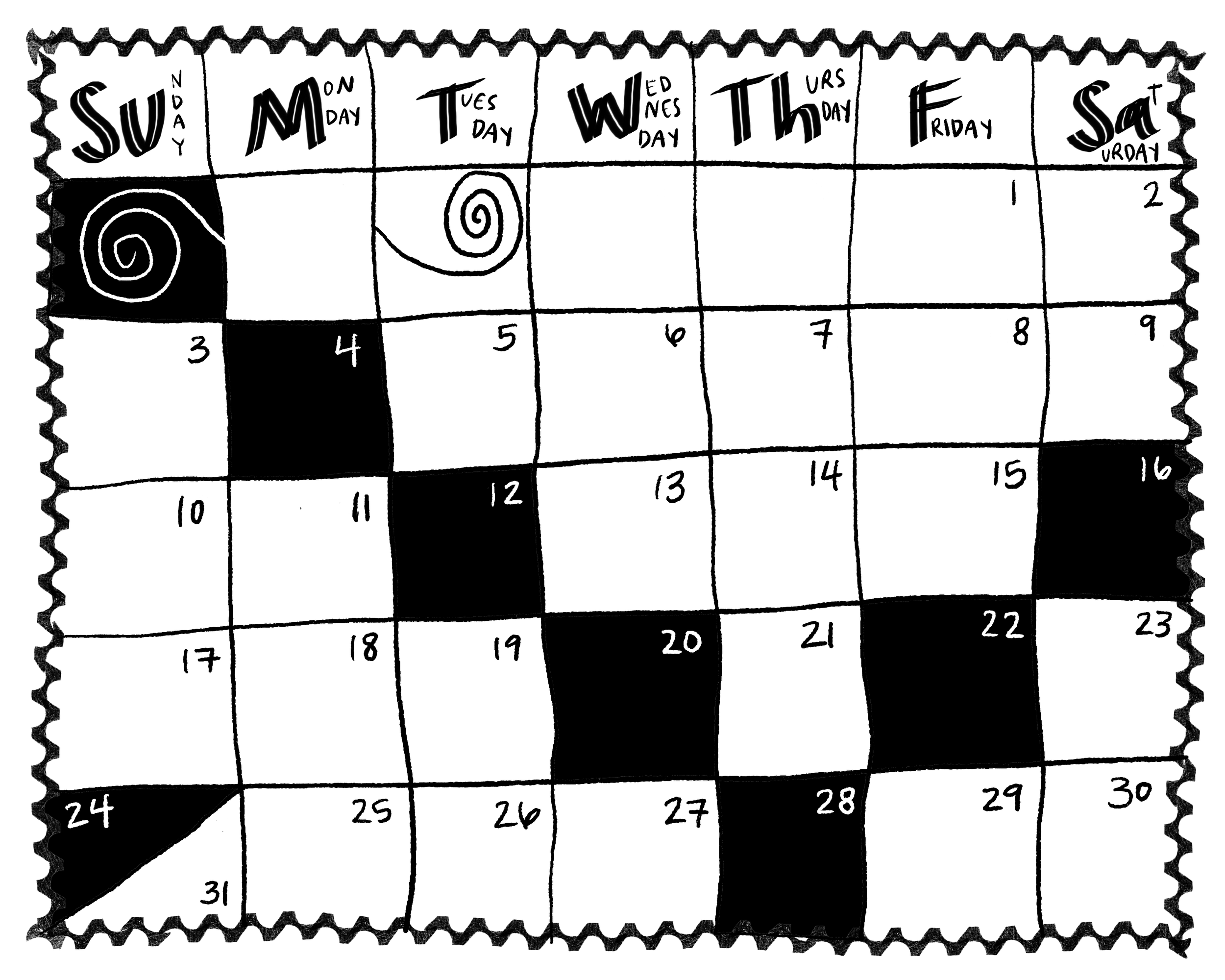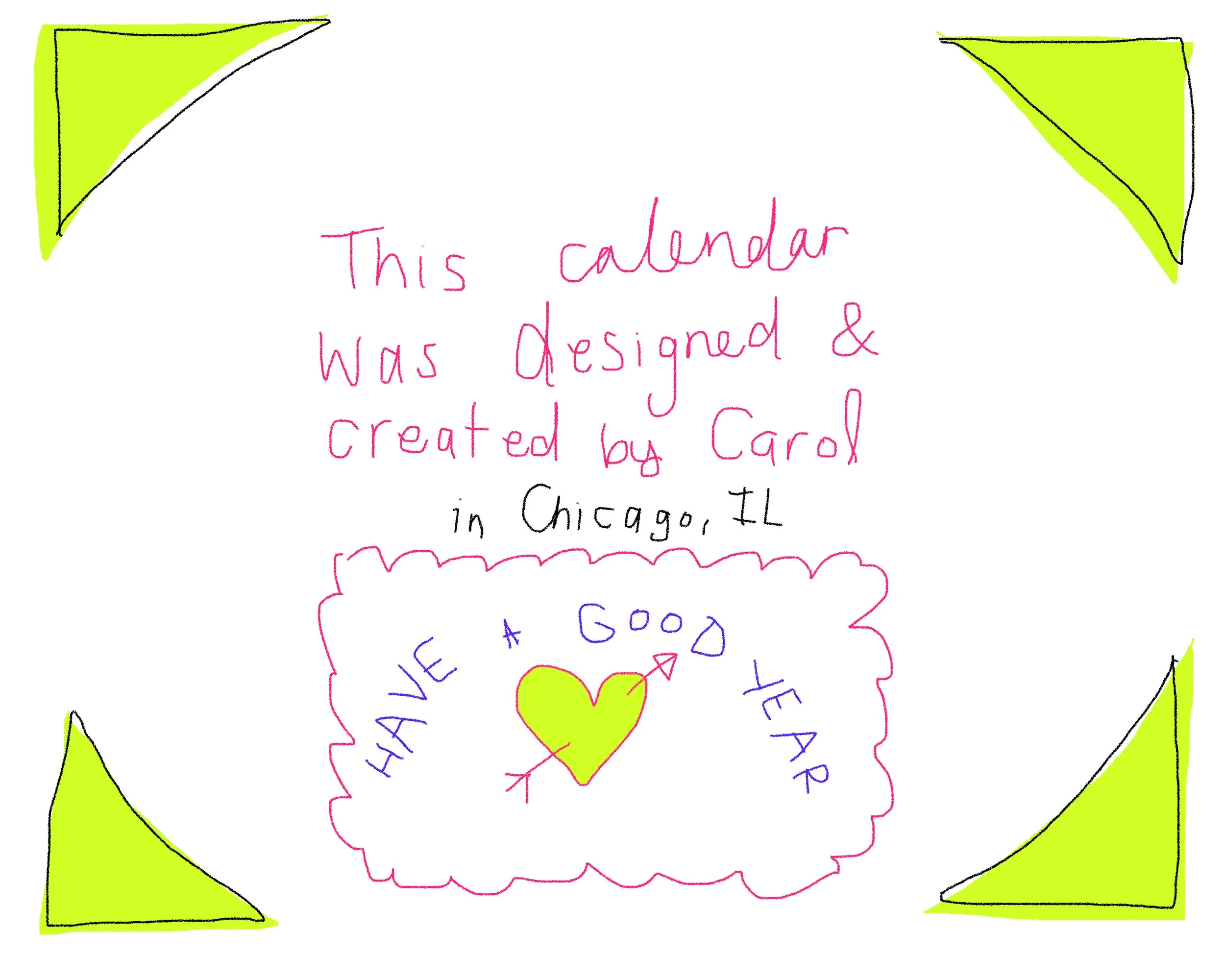 Hand inked month pages, scanned into Photoshop, layered, colorized, collaged. Printed at Printworks in Chicago, IL. Limited run of 40.