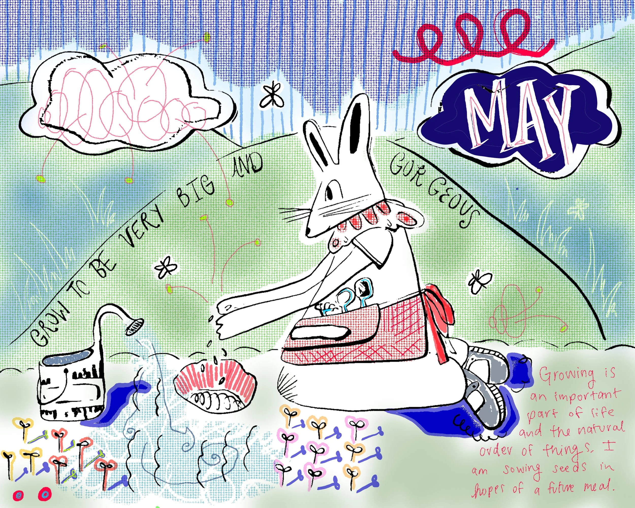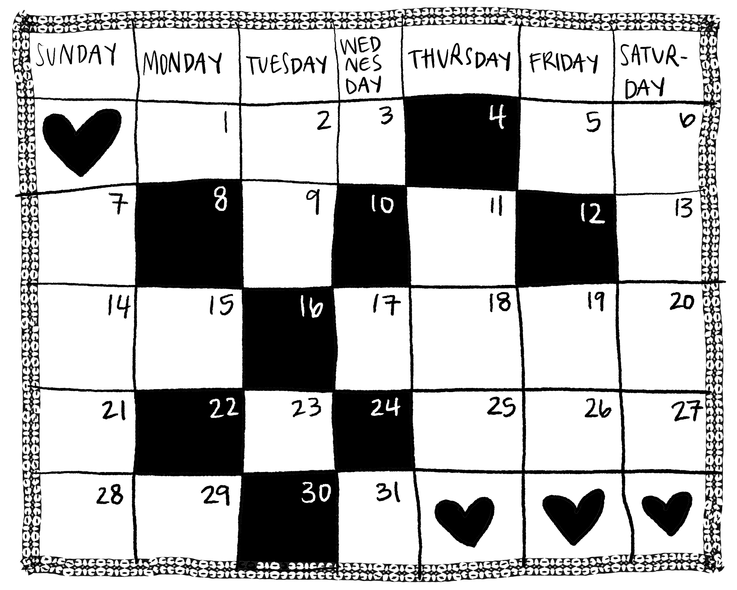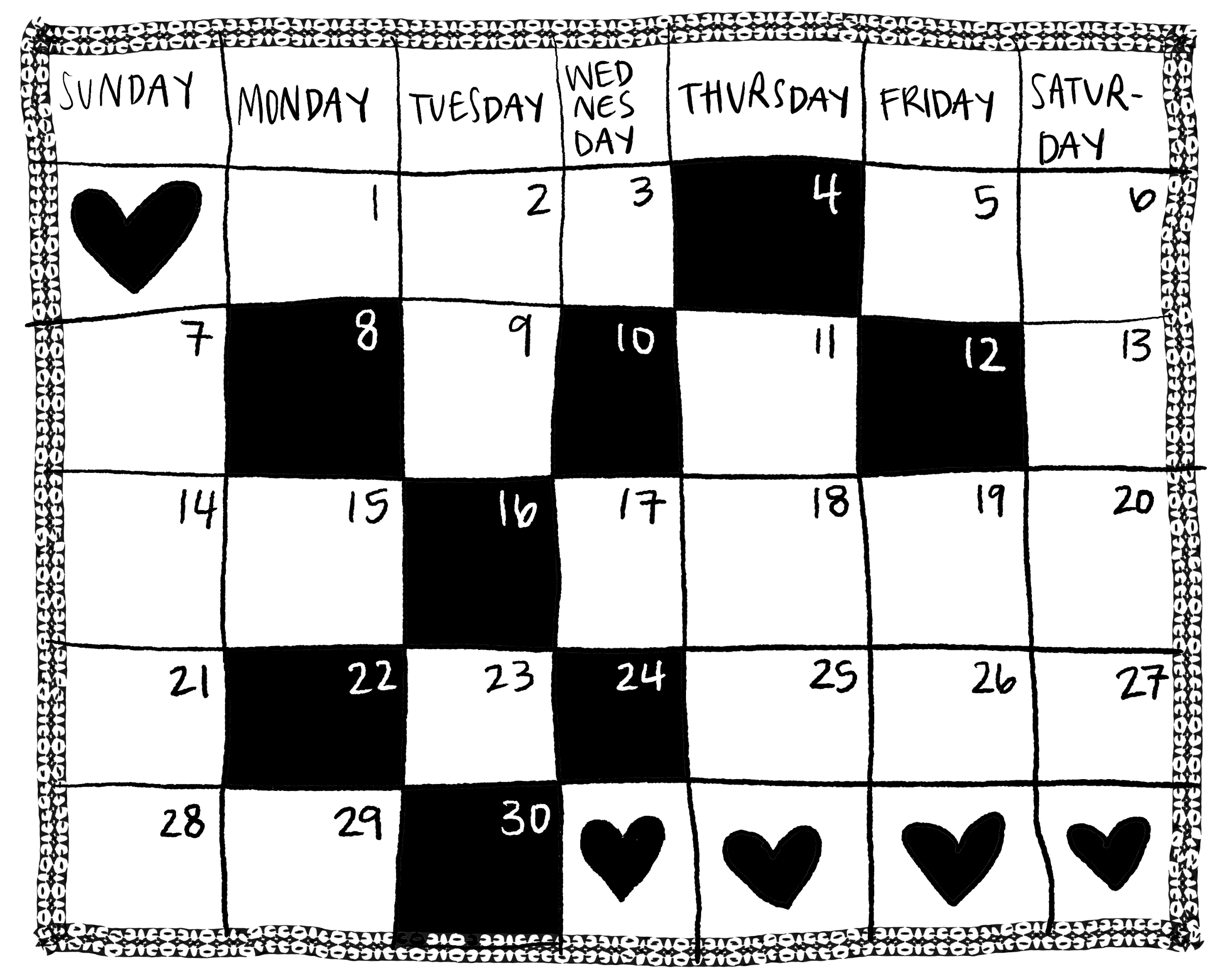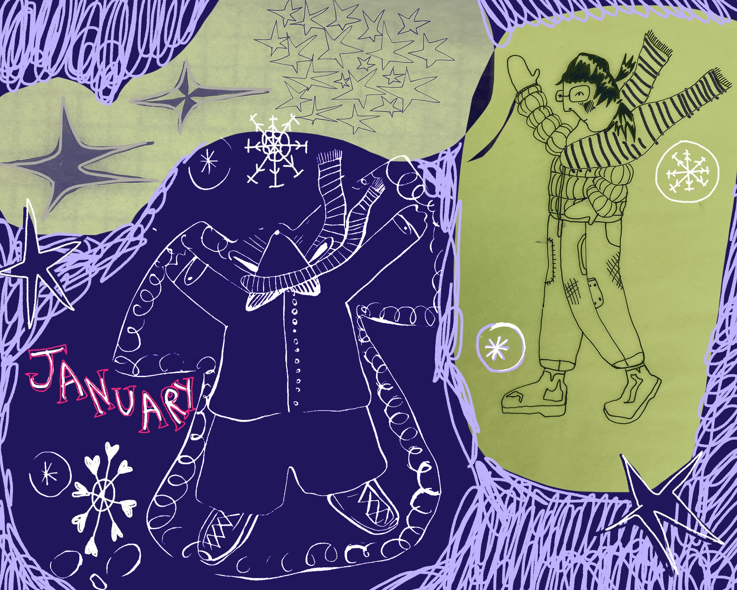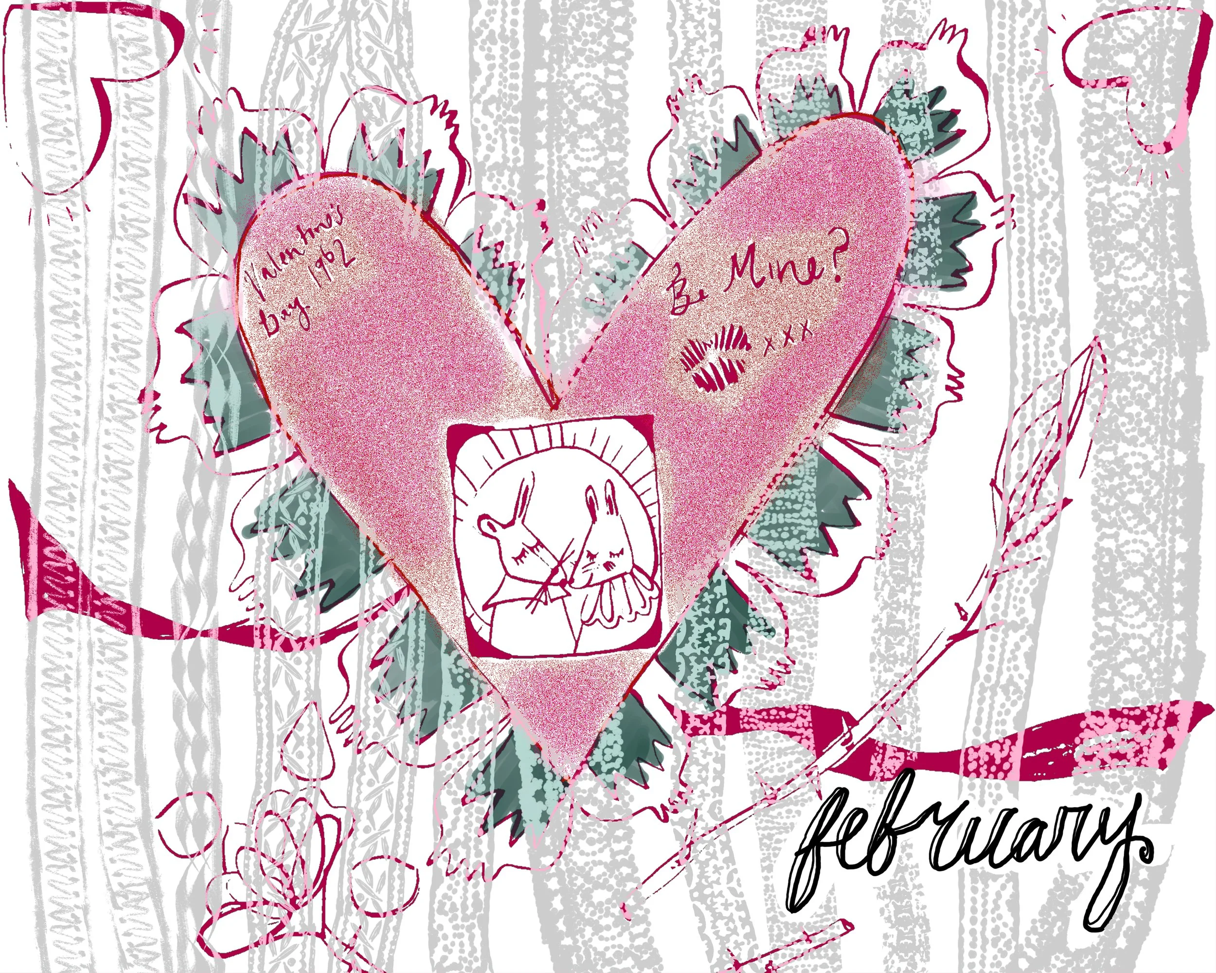 Hand inked month pages, scanned into Photoshop, layered, colorized, collaged. Printed at Printworks in Chicago, IL. Limited run of 40.